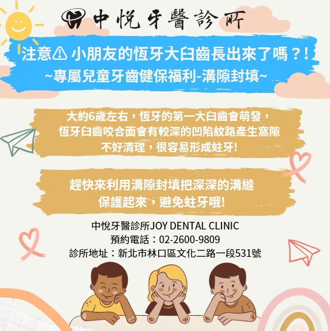 溝隙封填 首頁 最新消息 溝隙封填 注意⚠️ 小朋友的恆牙大臼齒長出來了嗎? 孩子的蛀牙不可忽視 安心交給 #中悅牙醫-#曾緯嘉醫師 蟲蟲終結者! 眾所皆知臼齒得咬合面會有比較深的紋路-俗稱窩溝 窩溝比較難徹底清理乾淨,容易卡髒污及細菌,這時蛀牙蟲蟲就會找上門來了! 趕快來#中悅牙醫 利用 #溝隙封填 把深深的溝縫保護起來,避免蛀牙哦!
