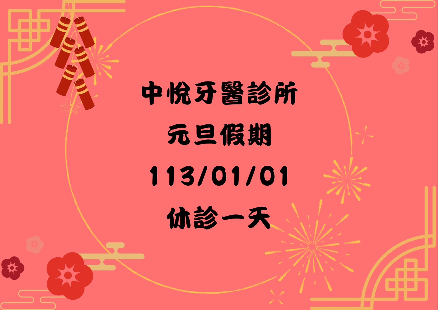 新年假期開始囉中悅牙醫診所祝大家新年快樂,新的一年萬事亨通