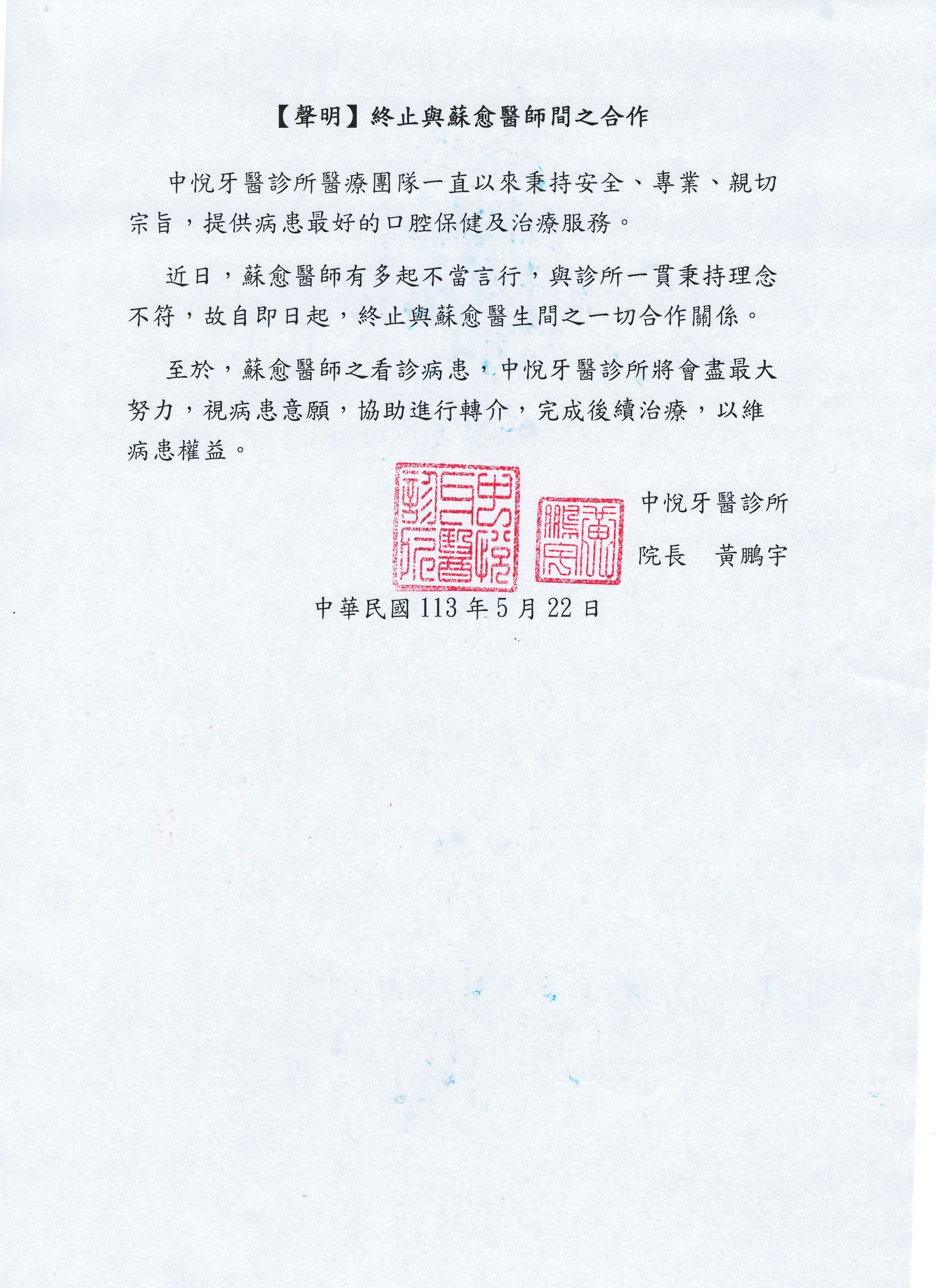 終止與蘇愈醫師合作關係