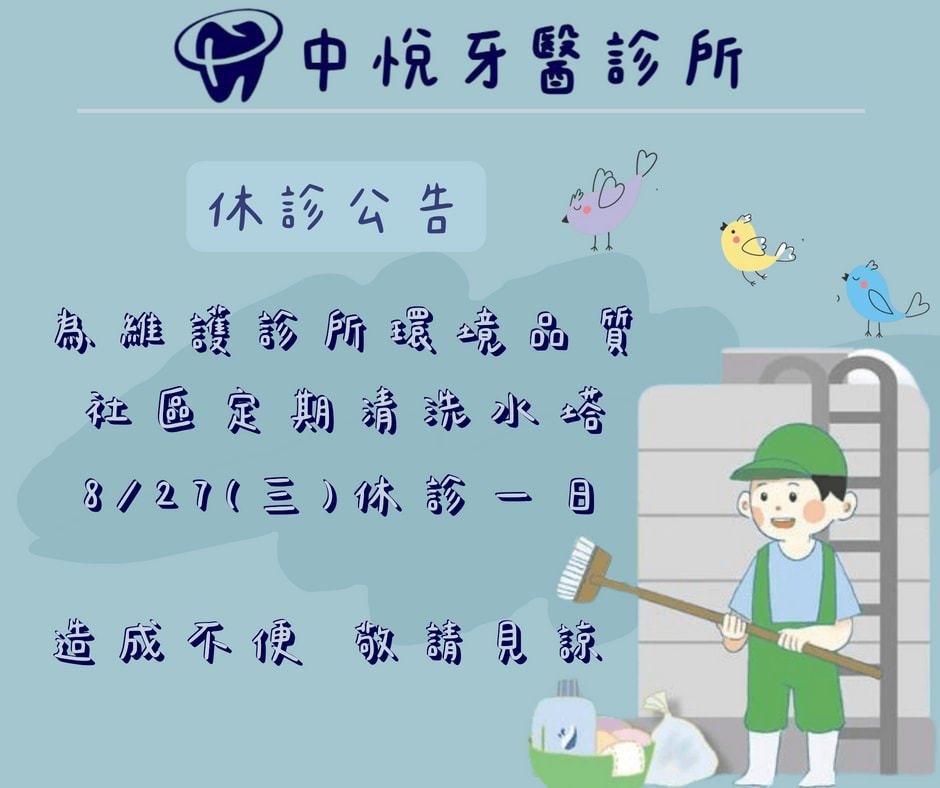 休診公告 首頁 最新消息 休診公告 休診公告 中悅牙醫診所為維護診所品質 114/8/27休診一日 將進行清洗水塔工作 如有任何問題記得提早致電預約 中悅牙醫診所JOY DENTAL CLINIC 預約電話:02-2600-9809 診所地址:新北市林口區文化二路一段531號(旁有廣停一停車場) #林口牙醫 #專科醫師 #中悅牙醫 #口腔外科專科 #假牙贋復專科 #齒顎矯正專科 #牙周病專科 #顯微根管專科 #家庭牙科 #舒眠麻醉