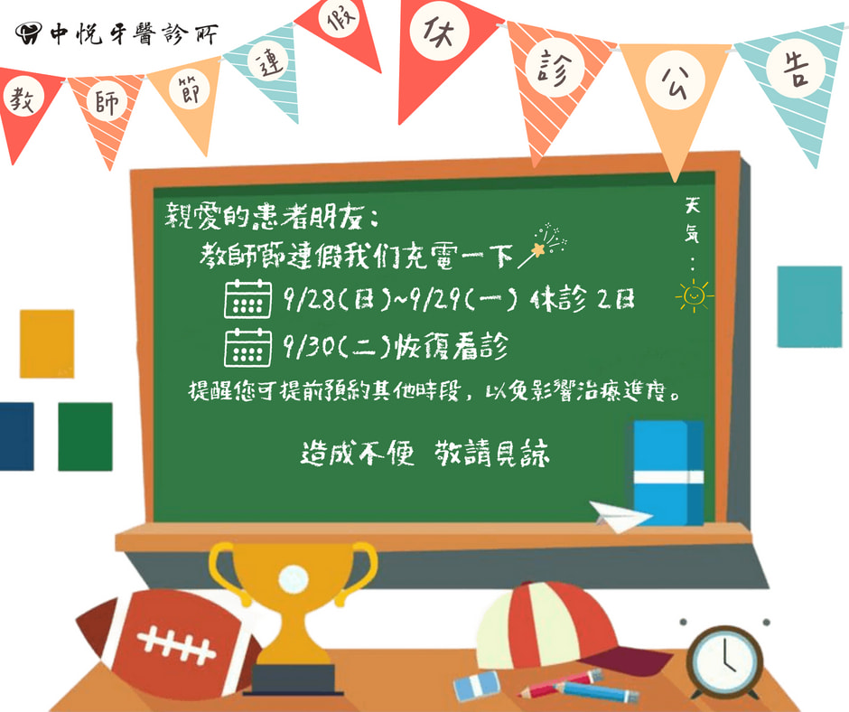 教師節休診公告 首頁 最新消息 教師節休診公告 教師節連假 休診通知 9/28(六)-9/29(日) 休診兩日 9/30(一) 起恢復正常看診 溫馨提醒:建議您可提前預約其他時段,以免影響治療進度。 在此向所有辛勤的老師們致上最高敬意, 祝您 教師節快樂,笑口常開! 中悅牙醫診所JOY DENTAL CLINIC 預約電話:02-2600-9809 診所地址:新北市林口區文化二路一段531號(旁有廣停一停車場) #林口牙醫 #專科醫師 #中悅牙醫 #口腔外科專科 #假牙贋復專科 #齒顎矯正專科 #牙周病專科 #顯微根管專科 #家庭牙科 #舒眠麻醉