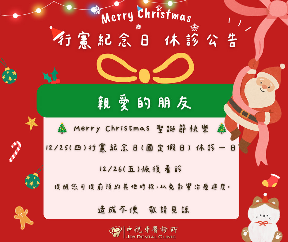 行憲紀念日休診公告 首頁 最新消息 行憲紀念日休診公告 ✨Merry Christmas 聖誕節快樂✨ 親愛的患者您好: 12月25日(四)行憲紀念日(國定假日)休診一日 12/26(五)恢復看診 感謝您一年來的信任與支持, 祝福您聖誕節快樂、平安健康、幸福滿滿 ✨ 造成不便,敬請見諒 ◆溫馨提醒: 建議您可提前預約其他時段,以免影響治療進度。 中悅牙醫診所JOY DENTAL CLINIC 預約電話:02-2600-9809 診所地址:新北市林口區文化二路一段531號(旁有廣停一停車場) #林口牙醫 #專科醫師 #中悅牙醫#口腔外科專科 #假牙贋復專科 #齒顎矯正專科 #牙周病專科 #顯微根管專科 #家庭牙科 #舒眠麻醉 #兒童牙科