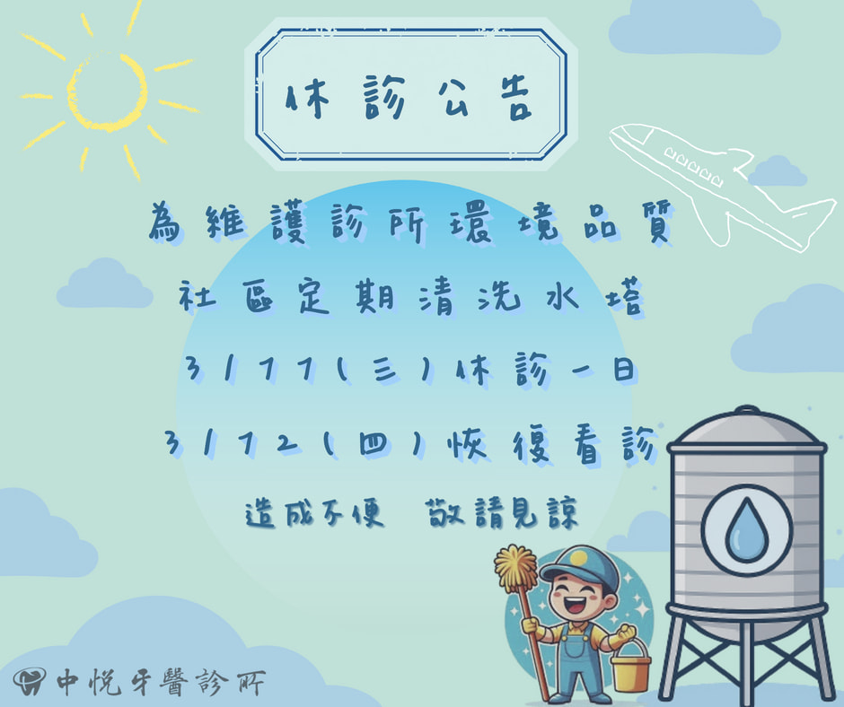 休診公告 首頁 最新消息 休診公告 休診公告 中悅牙醫診所為維護診所品質 115/3/11(三)休診一日 115/3/12(四)恢復看診 社區定期清洗水塔 如有任何問題記得提早致電預約 中悅牙醫診所JOY DENTAL CLINIC 預約電話:02-2600-9809 診所地址:新北市林口區文化二路一段531號(旁有廣停一停車場) #林口牙醫 #專科醫師 #中悅牙醫 #口腔外科專科 #假牙贋復專科 #齒顎矯正專科 #牙周病專科 #顯微根管專科 #家庭牙科 #舒眠麻醉